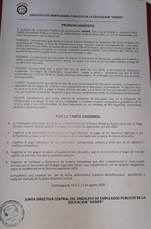 Por lo que exigieron “la publicación inmediata del acta de entendimiento en el Diario Oficial La Gaceta para que se haga efectivo nuestro reajuste salarial acordado para el mes de septiembre del año 2020”, solicitaron.
