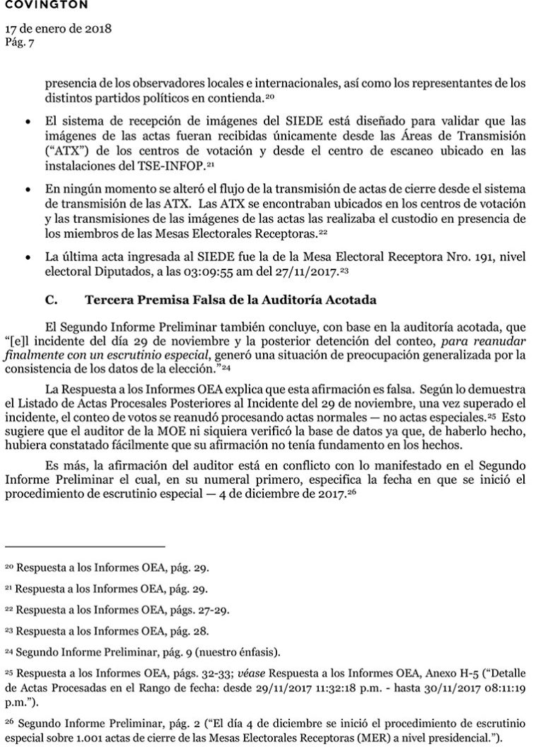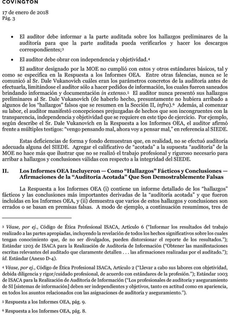 El documento, que se resumen en ocho páginas, señala que la auditoría practicada por el técnico de la OEA adoleció de graves errores de forma de y fondo que contaminaron los hallazgos y conclusiones de los informes de la OEA.