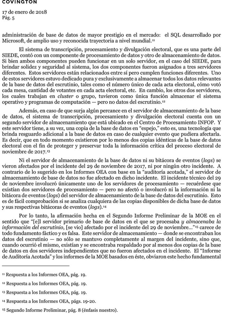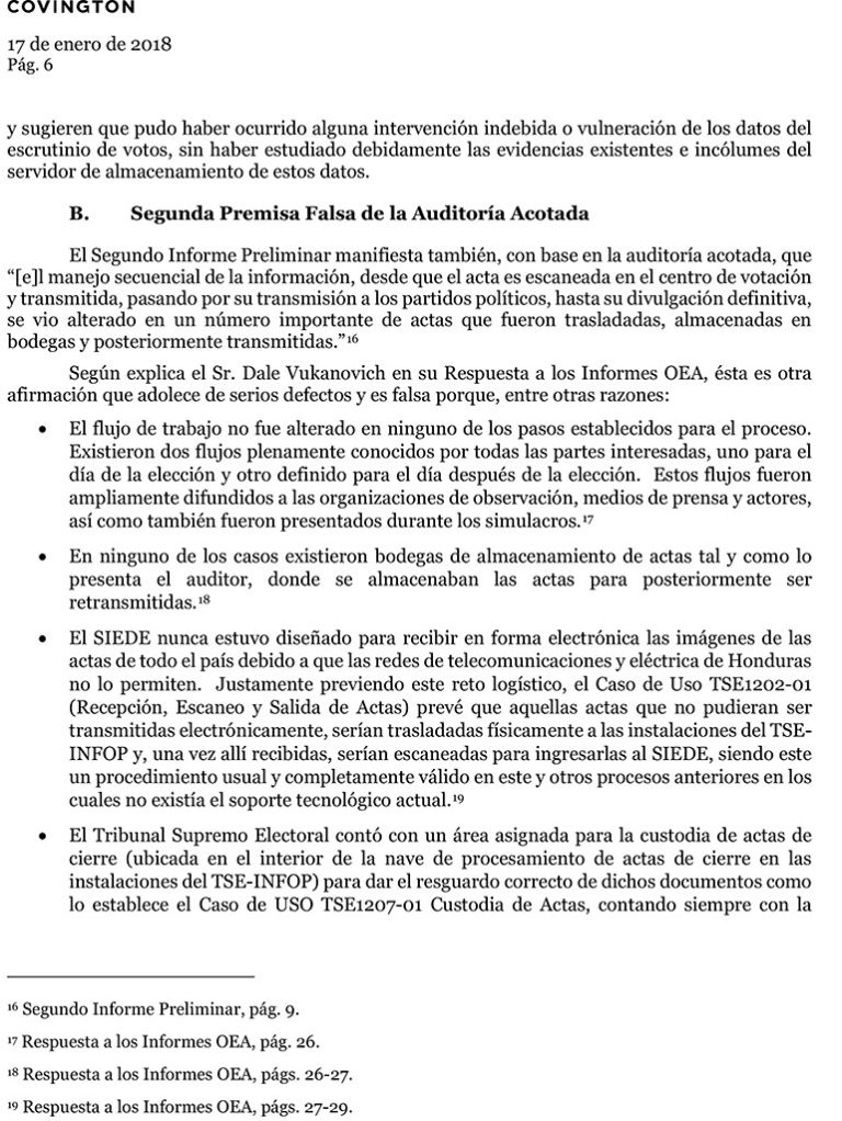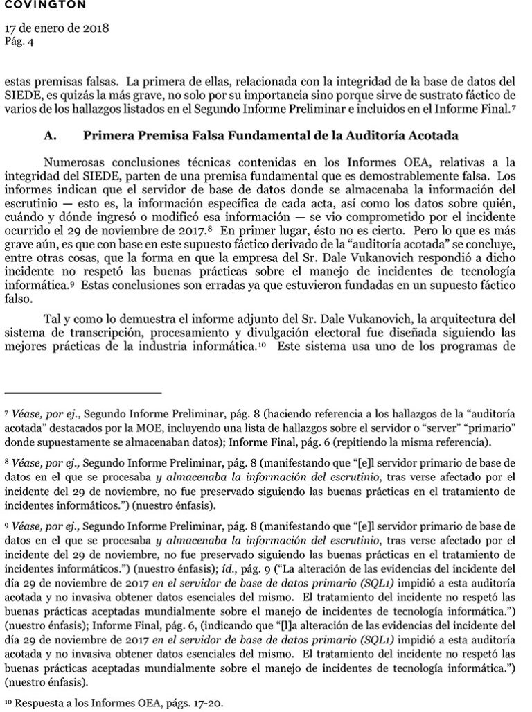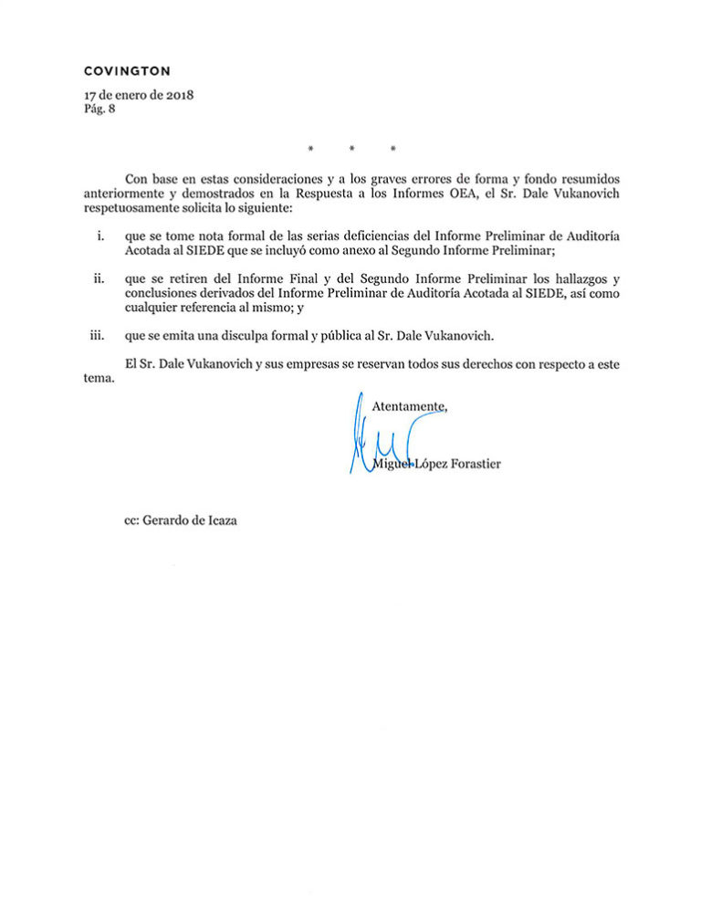 El escrito enviado hoy a la OEA está firmado por el apoderado legal de la empresa Dale Vukanovich, Miguel López Forastler, con la referencia “Informe final de la Misión de Observación Electoral (MOE) de la OEA en Honduras-Impugnación de Hallazgos Técnicos sobre el Sistema Integrado de Escrutinio y Divulgación Electoral (SIEDE)”.