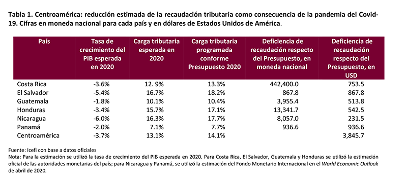 Basado en las proyecciones de crecimiento económico oficiales y en los resultados más actualizados de la recolección de impuestos, el Instituto Centroamericano de Estudios Fiscales (Icefi) estimó que en 2020 la recaudación tributaria de los Estados centroamericanos se reducirá en conjunto en el equivalente a USD3,845.7 millones (0.92% del PIB regional), como resultado de los efectos de la pandemia del Covid-19.