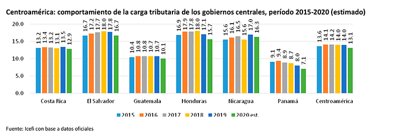 Desde una perspectiva regional, el Icefi estima que la carga tributaria de Centroamérica caerá de 14.0% en 2019, a 13.1% en 2020, que significará una deficiencia promedio de 0.9% del PIB respecto a los presupuestos vigentes en 2020.