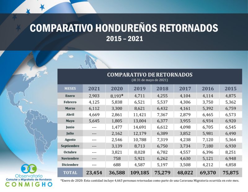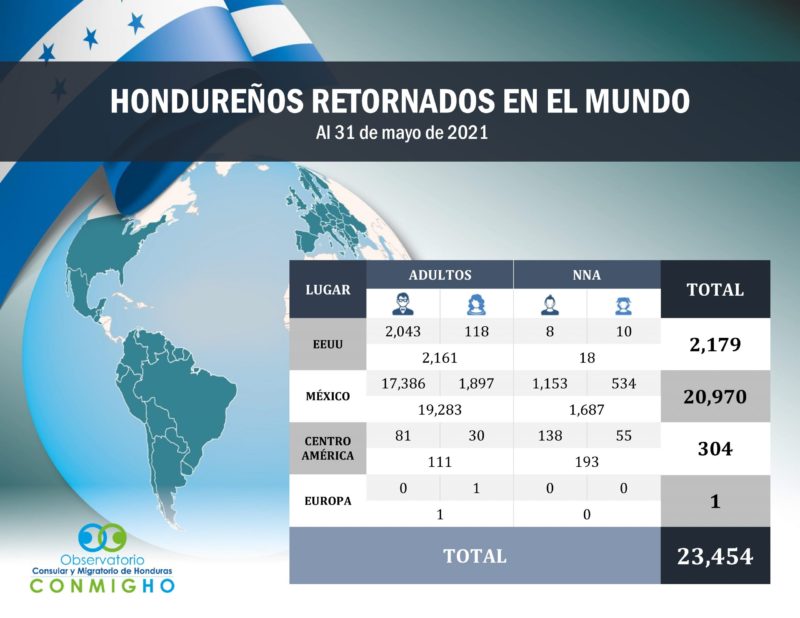 Según los datos recabados por el Observatorio Consular y Migratorio de Honduras (CONMIGHO) desde el 1 de enero hasta el 31 de mayo del presente año 23,454 hondureños han retornado al país.