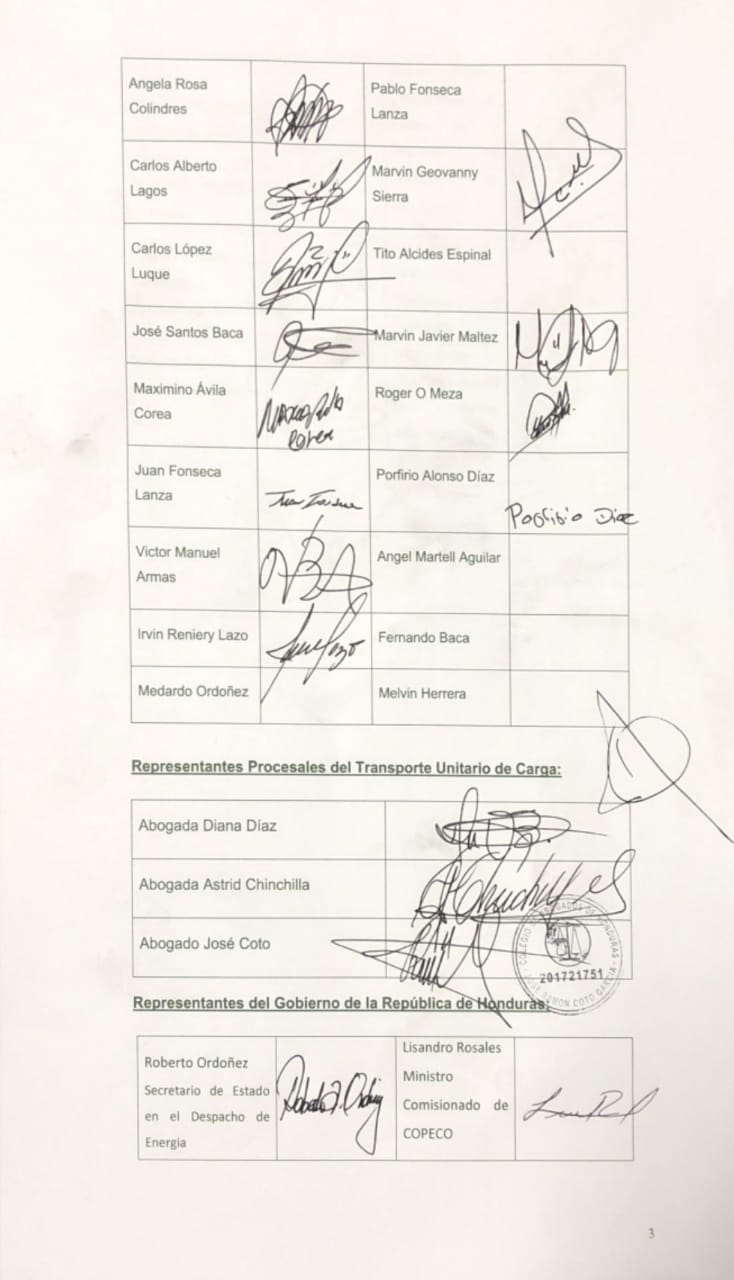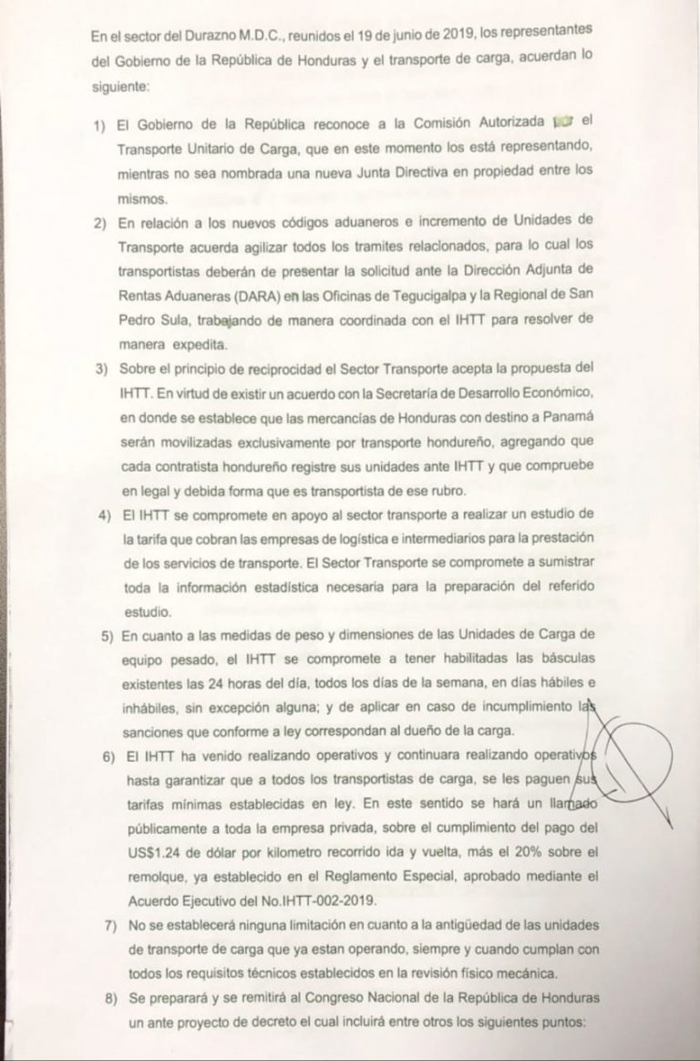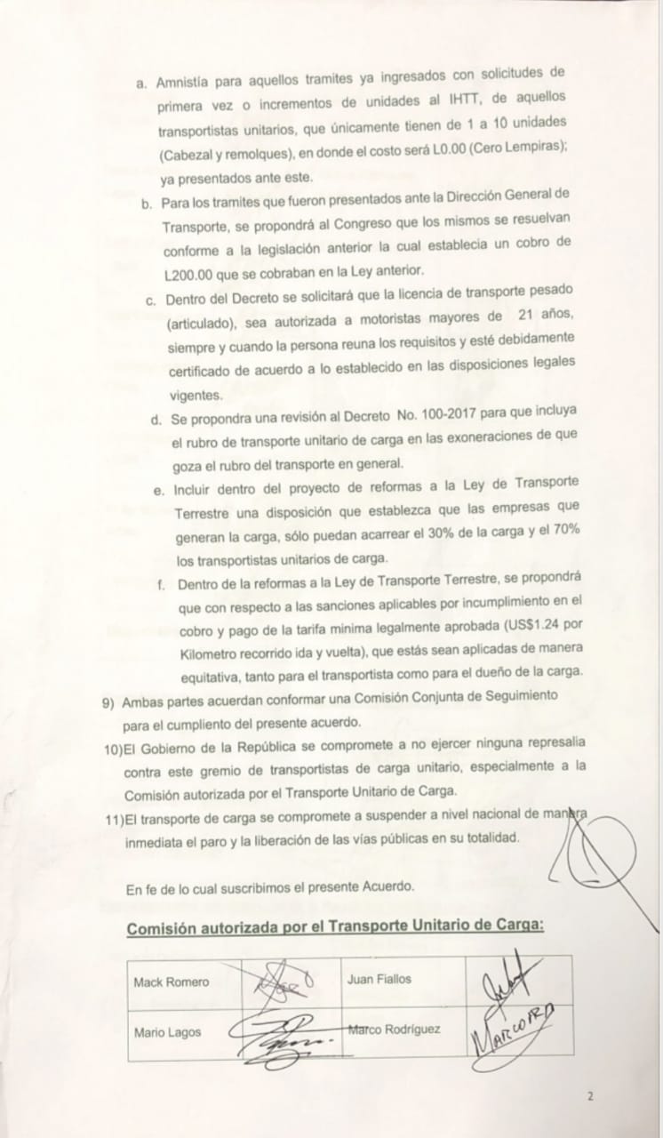 Otro de los puntos es que el Poder Ejecutivo se comprometió a enviar al Congreso Nacional un anteproyecto de ley para establecer una amnistía para trámites ya registrados de unidades ante el Instituto Hondureño de Transporte Terrestre (IHTT), para aquellos que tengan menos de diez unidades.