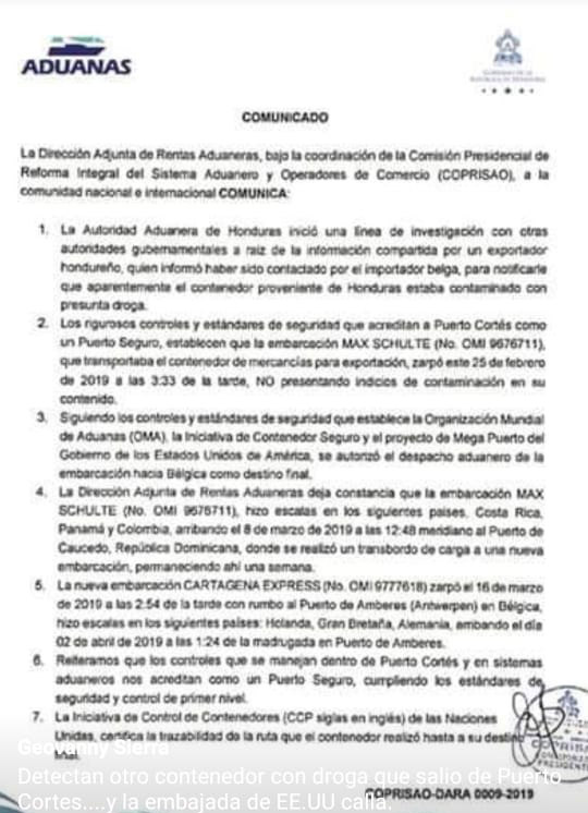 Según el comunicado, el importador en Bélgica contactó a un exportador hondureño, para notificarle que el contenedor proveniente de Honduras, llegó contaminado con droga.