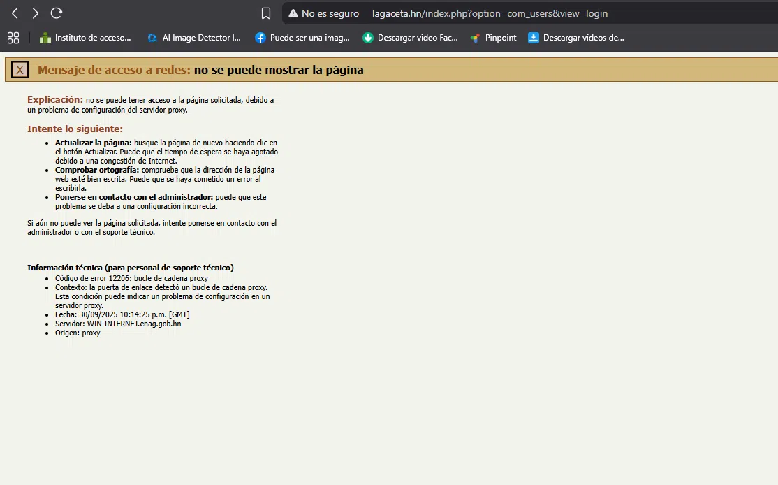 La página del Diario oficial La Gaceta presenta un error de conexión. De acuerdo con un técnico en informática al que consultó El Mirón, este error significa que la puerta de enlace detectó un ciclo (bucle) entre servidores proxybque impide que el sitio web se cargue correctamente. Añadió que el problema se debe a una mala configuración en los servidores del portal oficial y no a fallas en las computadoras de los usuarios.