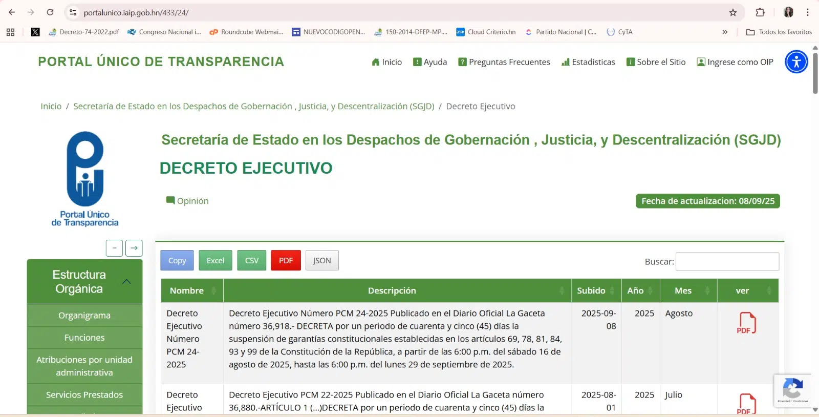 Asimismo, hicimos una búsqueda en el portal de la Secretaría de la Presidencia y en el Portal Único de Transparencia. En este último solo está el PCM 024-2025, correspondiente a la extensión vigésima tercera (23) extensión, con vigencia del 16 de agosto hasta las 6:00 pm del 29 de septiembre.