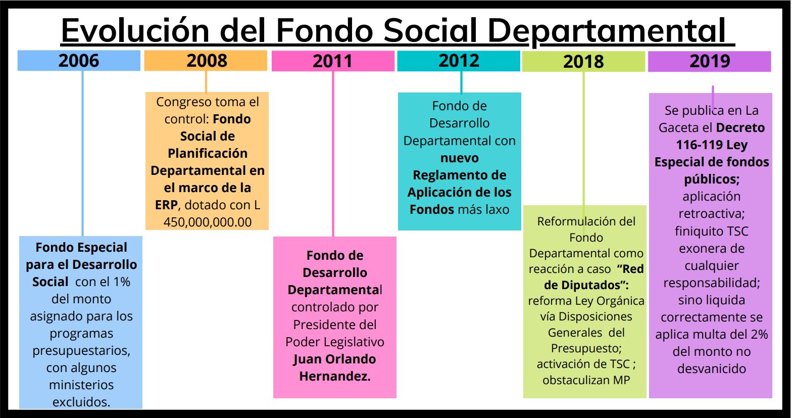 A lo largo de los 15 años de vigencia de esta iniciativa del Poder Legislativo, el Fondo Departamental ha evolucionado. El primer Fondo para el Desarrollo, se estableció durante el gobierno de Manuel Zelaya Rosales en 2007, pero en ese entonces no era gestionado por el Congreso.