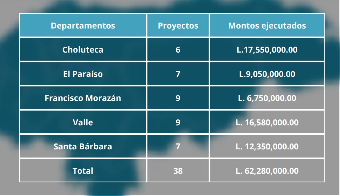 Los departamentos que fueron auditados a través de los proyectos ejecutados son: Choluteca con seis proyectos por un monto de L.17,550,000 lempiras; El Paraíso con siete proyectos por un monto de 9,050,000 de lempiras; Francisco Morazán con nueve proyectos por un monto de 6,750,000 lempiras; Valle con nueve proyectos por 16,580,000.00 lempiras y Santa Bárbara con siete proyectos por 12,350,000 lempiras, sumando en total 38 proyectos por 62,280,000 lempiras.