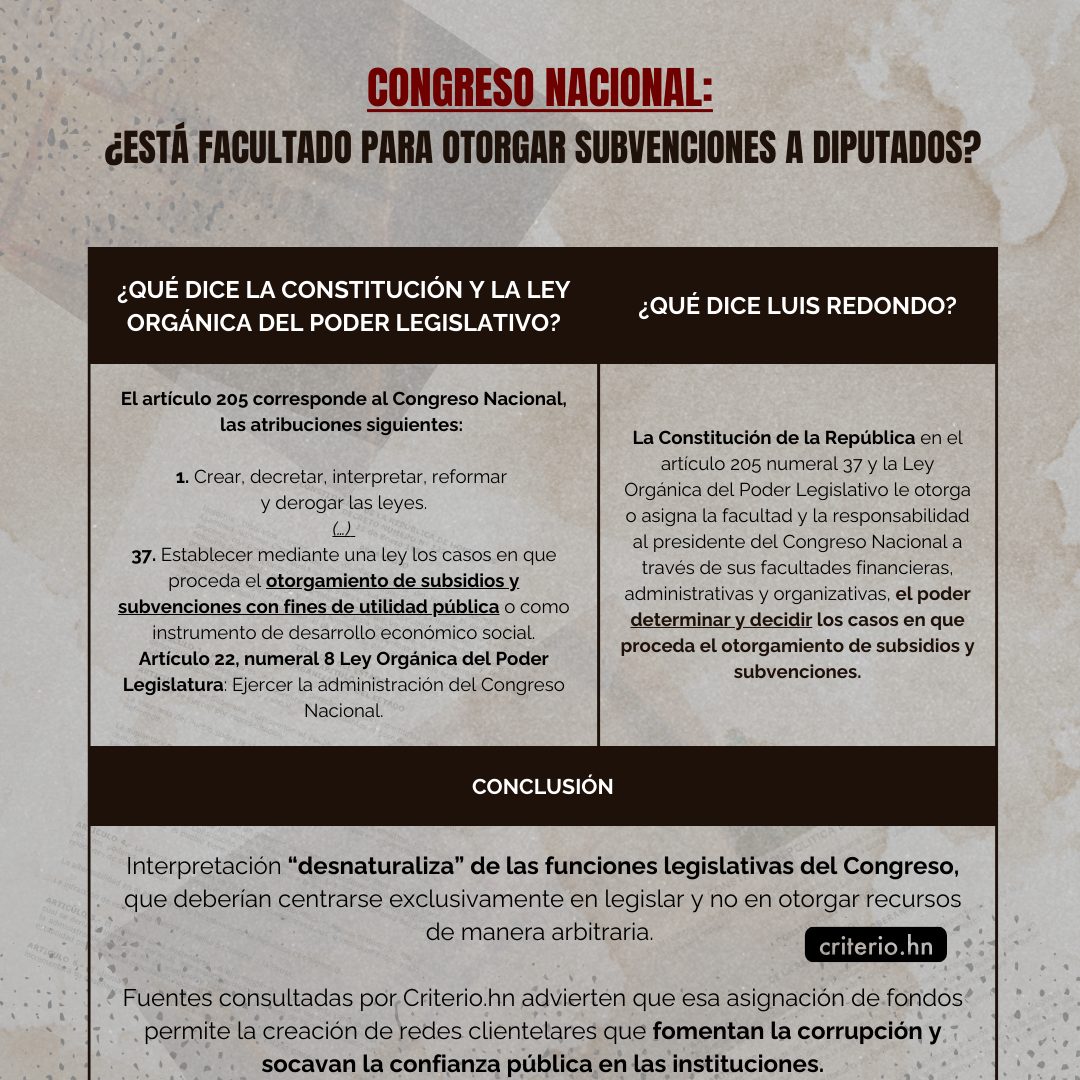 El presidente de Congreso Nacional, Luis Redondo –quien llegó a ese poder del Estado representando al Partido Salvador de Honduras (PSH) y que ahora milita en las filas del oficialista Partido Libertad y Refundación (Libre)— argumenta que el artículo 205 numeral 37 y artículo 22 numeral 8 de la Ley Orgánica del Poder Legislativo lo facultan para la entrega de subvenciones y subsidios