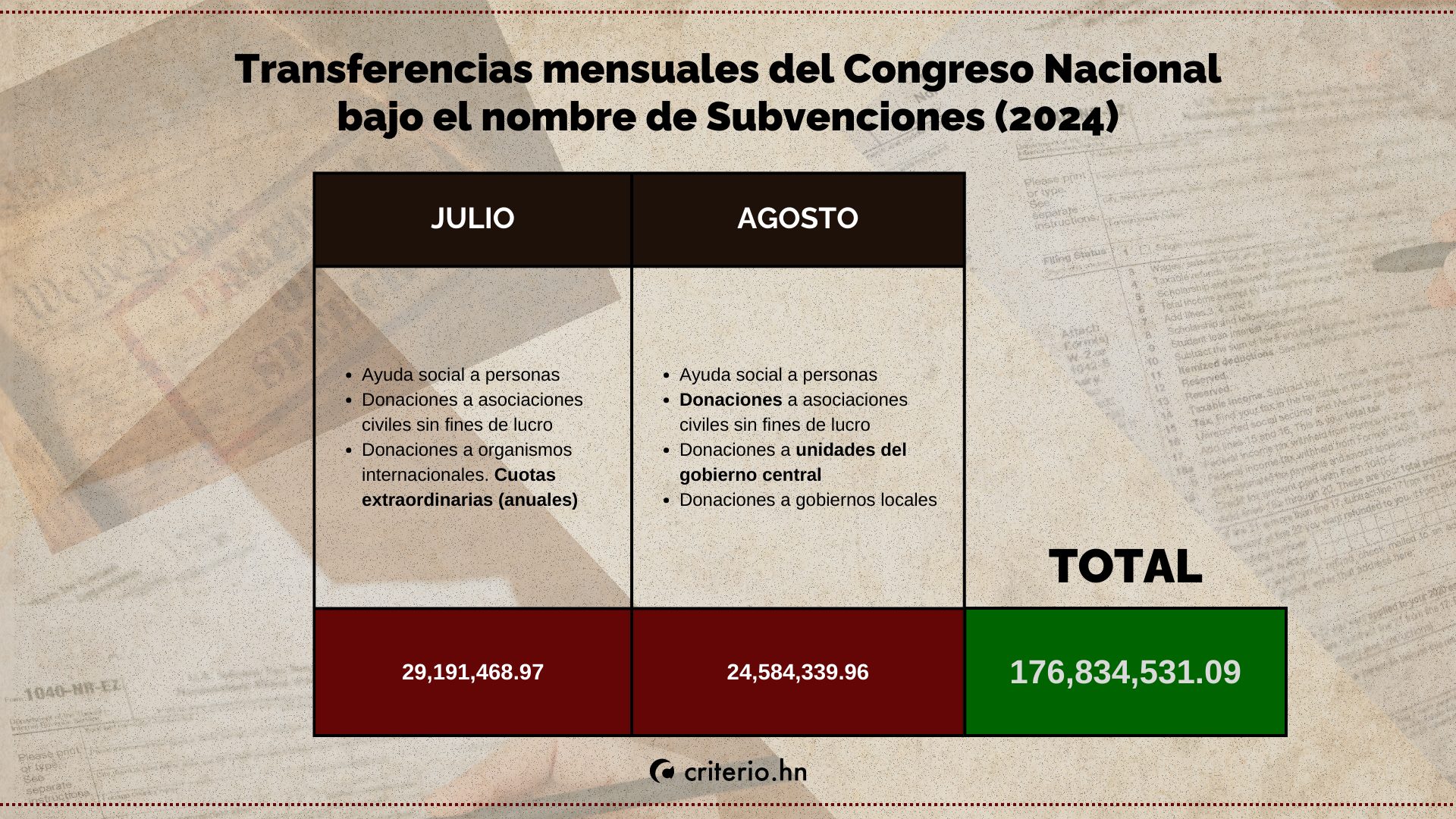 Criterio.hn le ha dado seguimiento a la entrega de fondos, y encontró que desde 2022 hasta agosto de 2024, se habían erogado 386,678,029.42 millones de lempiras (USD 15,548,462.77) en subvenciones a diputados, con una entrega de 176 millones de lempiras solo en 2024.