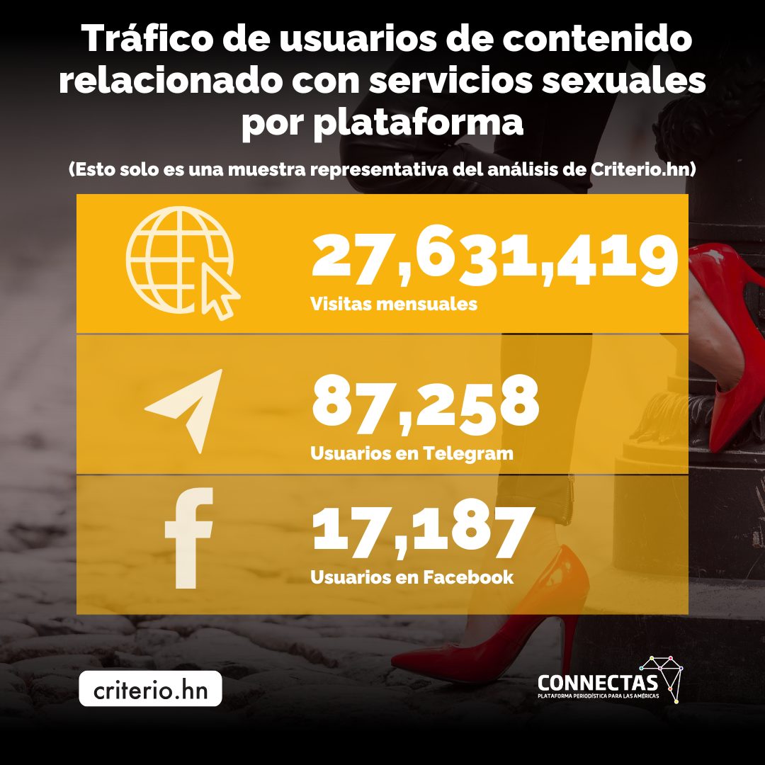 Mediante el monitoreo, Criterio.hn identificó una página dedicada a la venta de servicios sexuales en las principales ciudades del país. En la web ofrece distintos paquetes y un amplio catálogo de personas clasificadas según sexo, orientación sexual e identidad de género, con tarifas que son manejadas por horas.