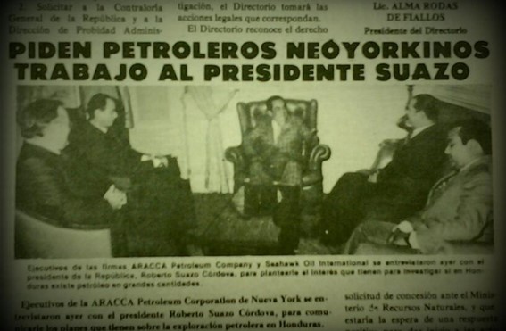 En 1982, ejecutivos de la ARACCA Petroleum Corporation de Nueva York se entrevistaron con el presidente Roberto Suazo Córdova para ver la posibilidad de explorar las costas hondureñas en busca de petróleo. Robert Stephen Haft, vicepresidente de la transnacional, dijo que andaba buscando trabajo en Honduras y esperaba obtener una concesión para iniciar en breve investigaciones, a fin de establecer la existencia de petróleo en este país. «Queremos ver si hay petróleo en Honduras y por eso estamos aquí, para explicarle al presidente hondureño nuestros planes de trabajo y conocer las posibilidades de que nos quedemos explorando».