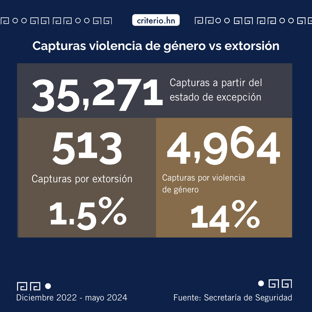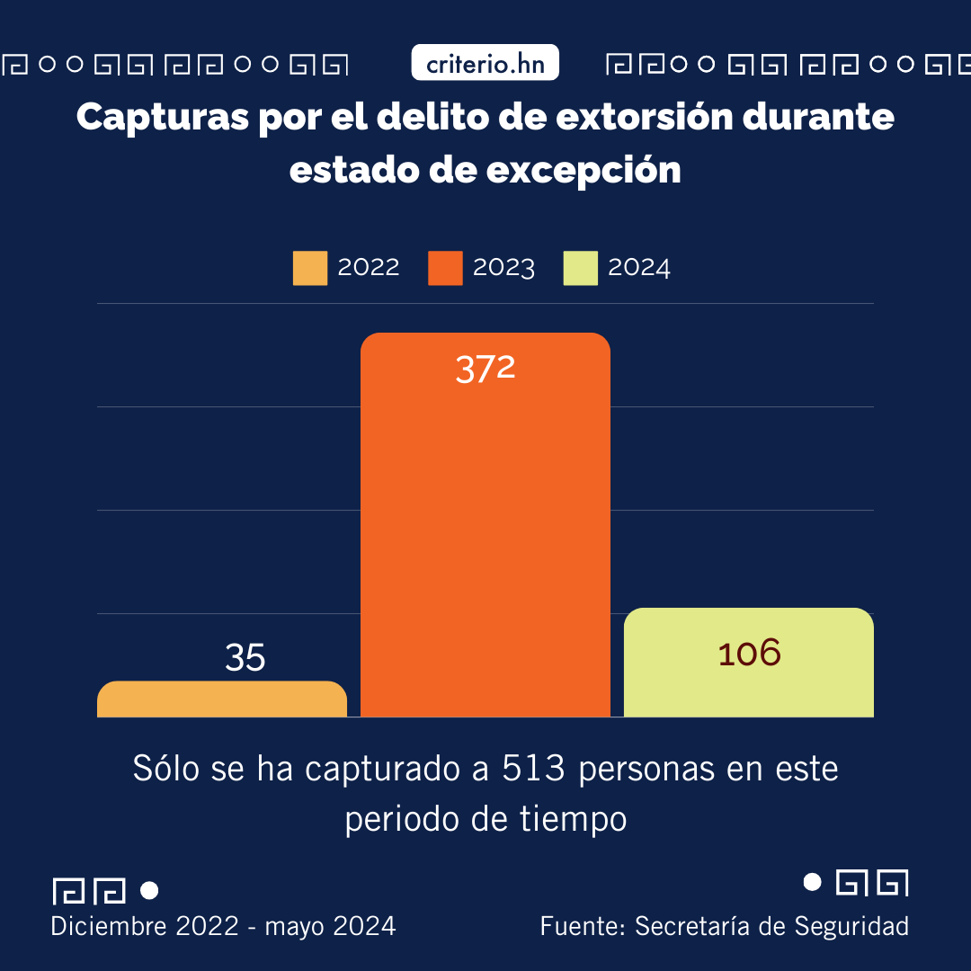 Además, la data solicitada a la Secretaría de Seguridad, indica que las 513 capturas por extorsión, sólo representan 1.4% de las 35,271 capturas efectuadas durante el estado de excepción.
