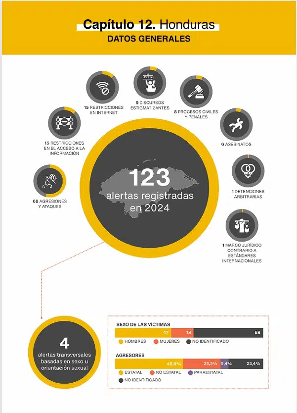 Para el caso de Honduras, el Estado se consolidó como el principal agresor contra la prensa en 2024, responsable del 45.9% de las alertas registradas, superando ampliamente el 35% reportado en 2023.