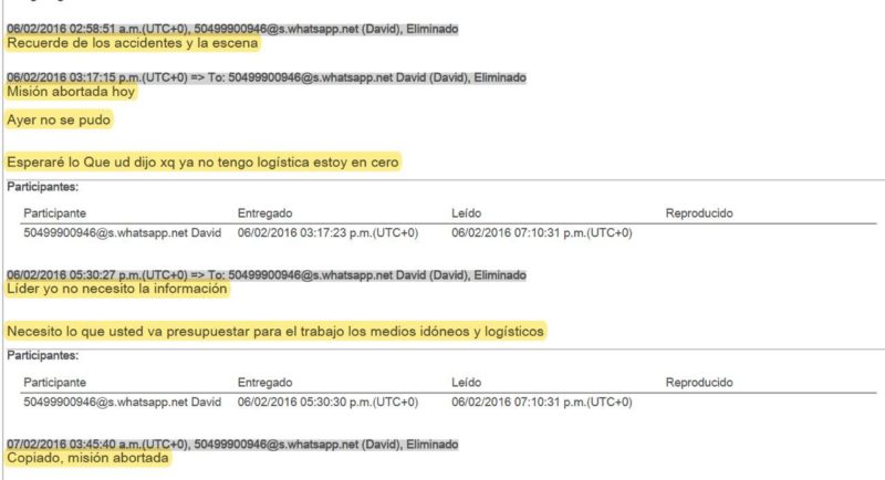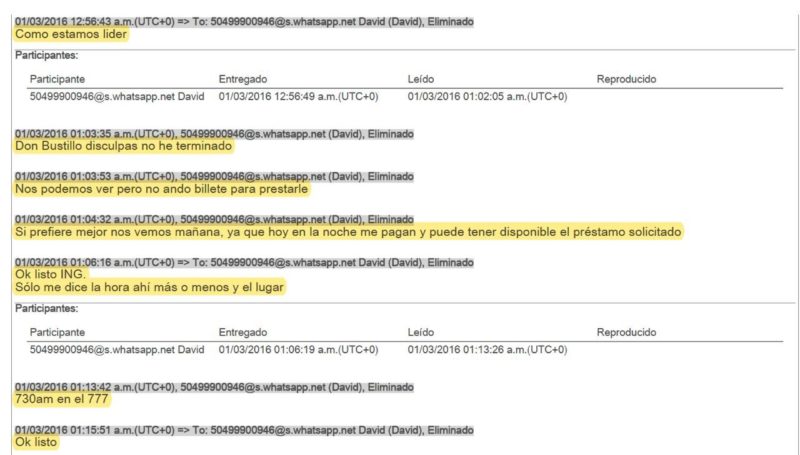 Dentro de los 88 medios de pruebas presentados para el proceso judicial en la Audiencia de Proposición de Pruebas contra David Castillo, hay extracciones de teléfonos celulares, información de antenas de telecomunicaciones que dan cuenta de intercambios por Whatsapp sobre la entrega de un supuesto préstamo de David Castillo a Douglas Bustillo el uno de marzo del 2016, un día antes de los hechos.