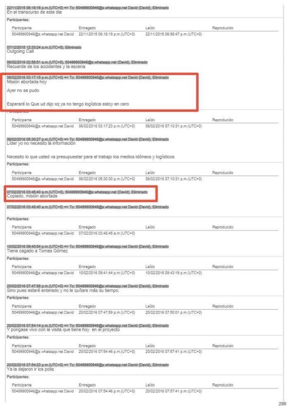 En una de las conversaciones presentadas como medio de prueba y que fueron extraídas del teléfono de Douglas Geovany Bustillo, Castillo y Bustillo mantienen un diálogo entre la tarde-noche del 06/02/2016 y la madrugada del 07/02/2016 en la que conversan sobre logística, presupuesto y una «misión abortada».