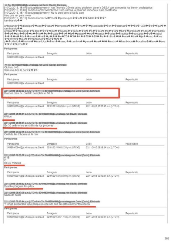 La charla por mensajería electrónica presentada en el juicio abarca el periodo de tiempo entre el 22/11/2015 y el 20/02/2016 y en el mismo además de los temas arriba expuestos se dan detalles del seguimiento que se realizaba contra otro de los integrantes del COPINH y la confirmación sobre una reunión que se llevaría a cabo el 22/11/2015 entre Bustillo y Castillo en un céntrico restaurante capitalino.