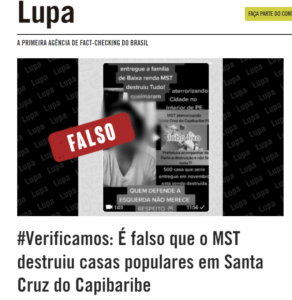 En octubre de 2021, circuló un video en el que una mujer denuncia que el Movimiento de los Trabajadores Rurales Sin Tierra (MST) destruyó viviendas en el municipio de Santa Cruz do Capibaribe, en Pernambuco. La narradora sugiere que estas propiedades serían entregadas a familias pobres y también afirma que esta acción se llevó a cabo a instancias del Partido de los Trabajadores (PT). Sin embargo, se trataba de una información falsa, según reportó la Agencia Lupa.