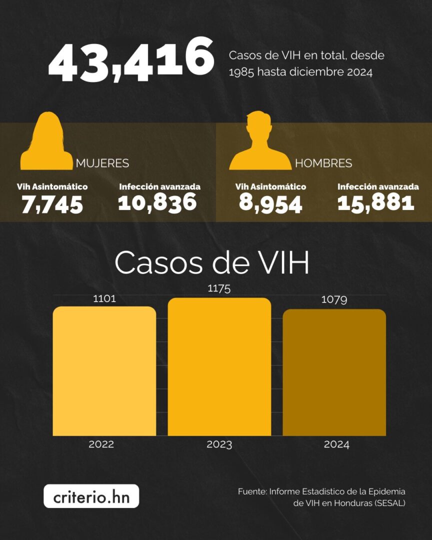 Desde el inicio de la epidemia en Honduras en mayo de 1985 hasta diciembre de 2024, de acuerdo con la Secretaría de Salud en el país se han registrado un total de 43,416 casos de VIH positivos, de los cuales 26,717 corresponden a infección avanzada y 16,699 a VIH asintomáticos.