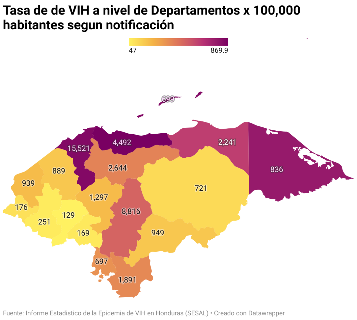En el Informe Estadístico de la Epidemia de VIH en Honduras de la Sesal, los departamentos de Cortés, Francisco Morazán, Atlántida, Colón, Yoro, Choluteca, Olancho e Islas de la Bahía acumulan el 89.52% de los casos notificados hasta el 2024.