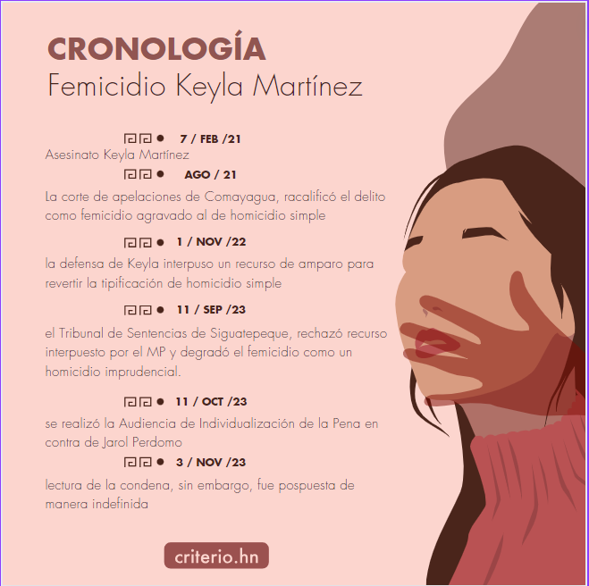 El femicidio de Keyla Martínez –tipificado como un homicidio imprudencial— sigue sin tener justicia. De acuerdo con las organizaciones de mujeres y su familia, de darse la sentencia para Jarol Perdomo, sería justica a medias por las diferentes prácticas dilatorias y tipificaciones del delito.