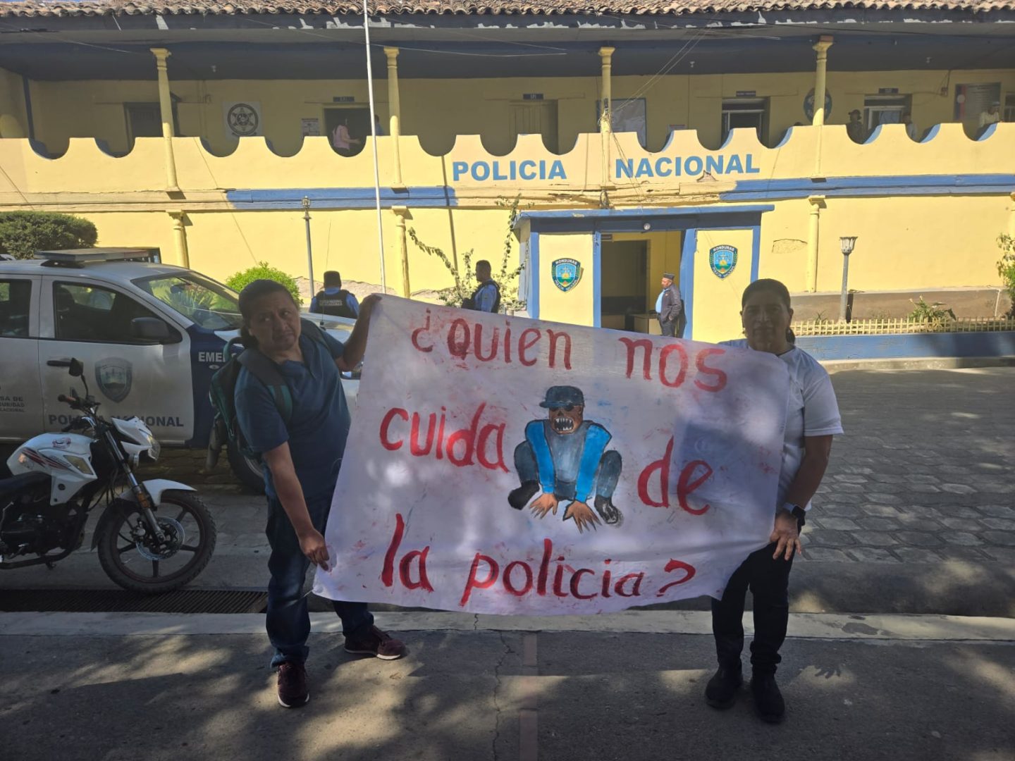En el plantón frente a la posta policial, una caricatura titulada “La mierda de justicia en Honduras”, toma preponderancia. Se observa a un hombre –que representa al juez de Sentencias— declarar al asesino inocente, mientras con su mano derecha hacia atrás, recibe un fajo de dinero.