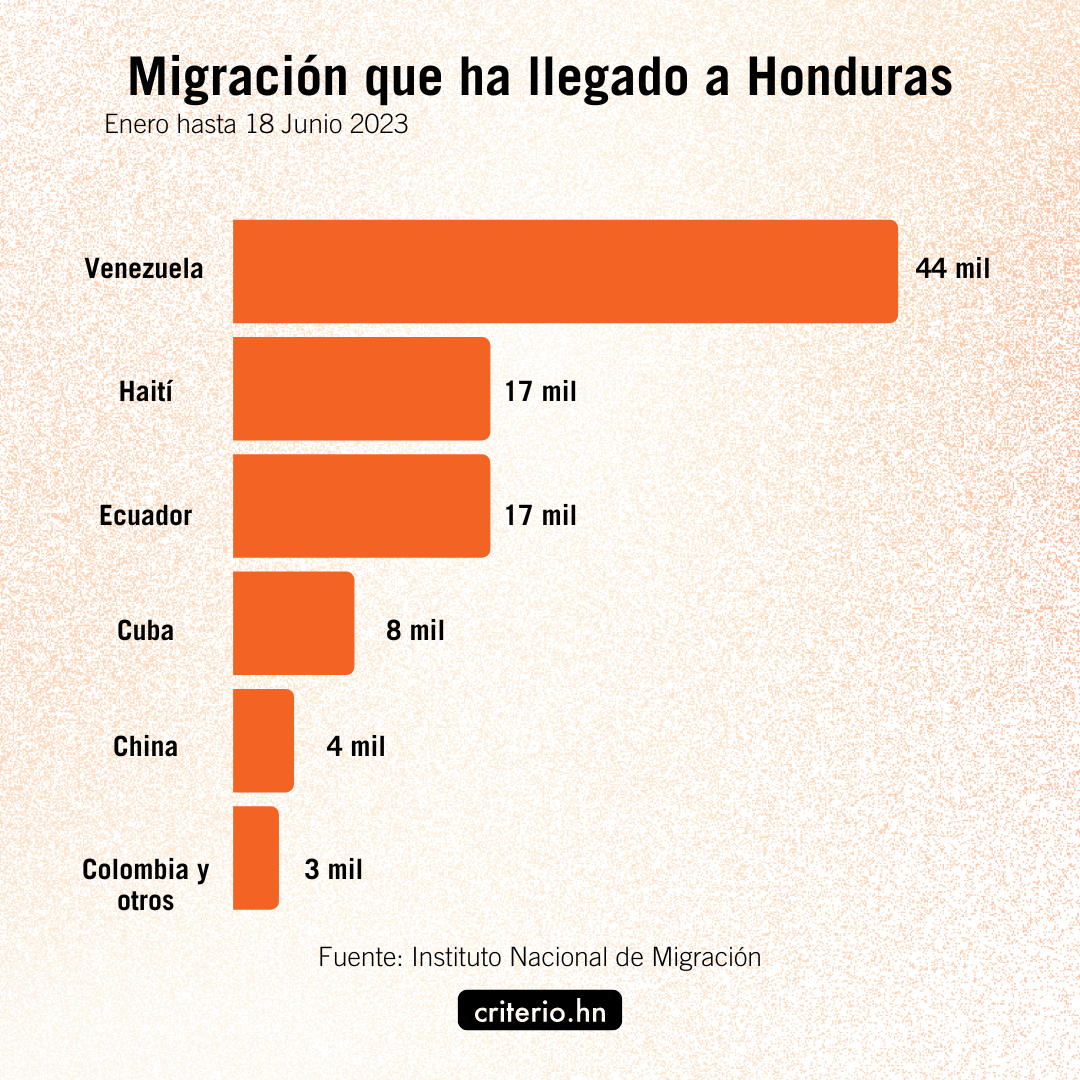 Según datos del Instituto Nacional de Migración en lo que va de 2023 y hasta el pasado 18 de junio entraron a Honduras 121,594 migrantes irregulares, de estos, 44 mil son de Venezuela, 17 mil de Haití, 17 mil de Ecuador, ocho mil de Cuba, cuatro mil de China y casi tres mil de Colombia entre otros.