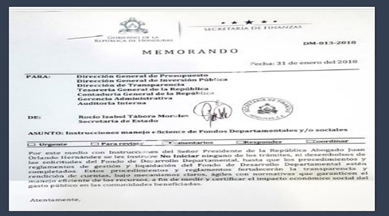 En enero del 2018 la SEFIN emite un memorándum explicando que no desembolsará recursos en concepto de Fondo de Desarrollo Departamental dado que no existen reglamentos completados para el control de estos fondos desconociendo totalmente el reglamento celebrado en el 2012.