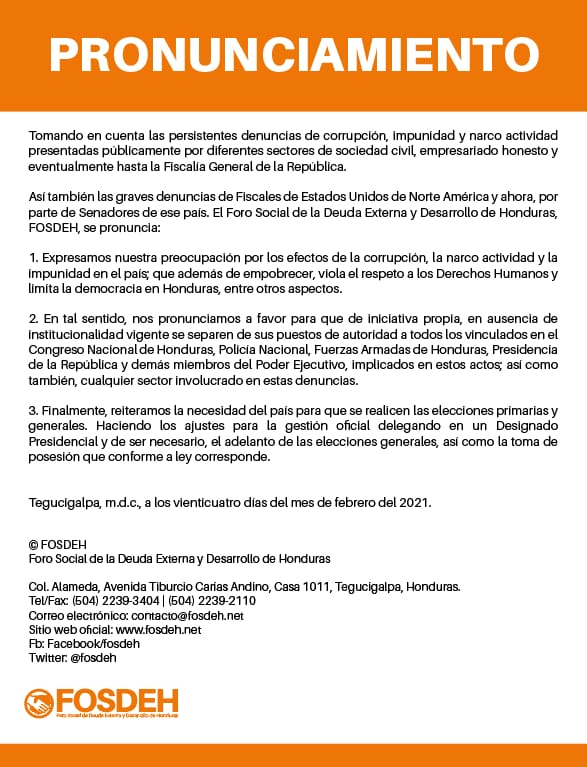 La organización emitió un comunicado público ante “las persistentes denuncias de corrupción, impunidad y narco actividad” presentadas públicamente por diferentes sectores de la sociedad, incluyendo al Ministerio Público a través de la Unidad Fiscal Especializada Contra Redes de Corrupción (Uferco) con el caso denominado Hermes, por el que está acusada una hermana del gobernante Juan Hernández.