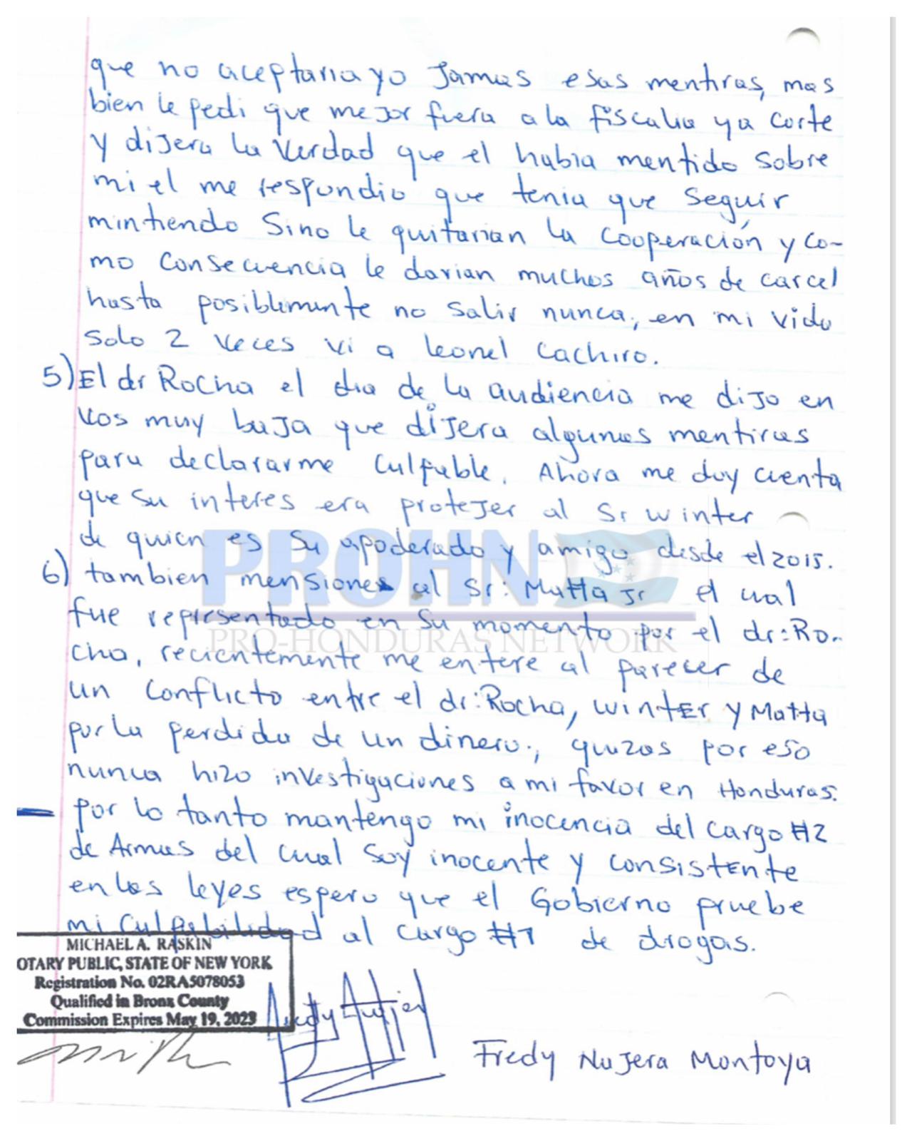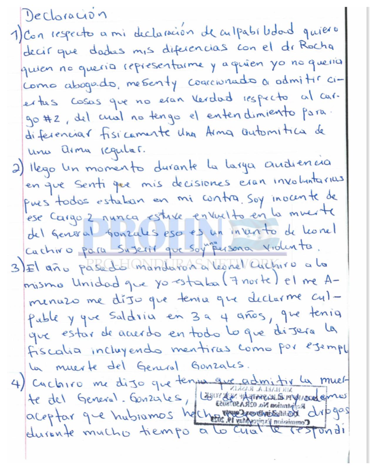A lo largo de la declaración señala además que quien lo ha estado mal aconsejando es el abogado de apellido Rocha quien busca proteger a Wilter Blanco y hundirlo a él y quizás por esa razón nunca hizo investigaciones a su favor en Honduras.