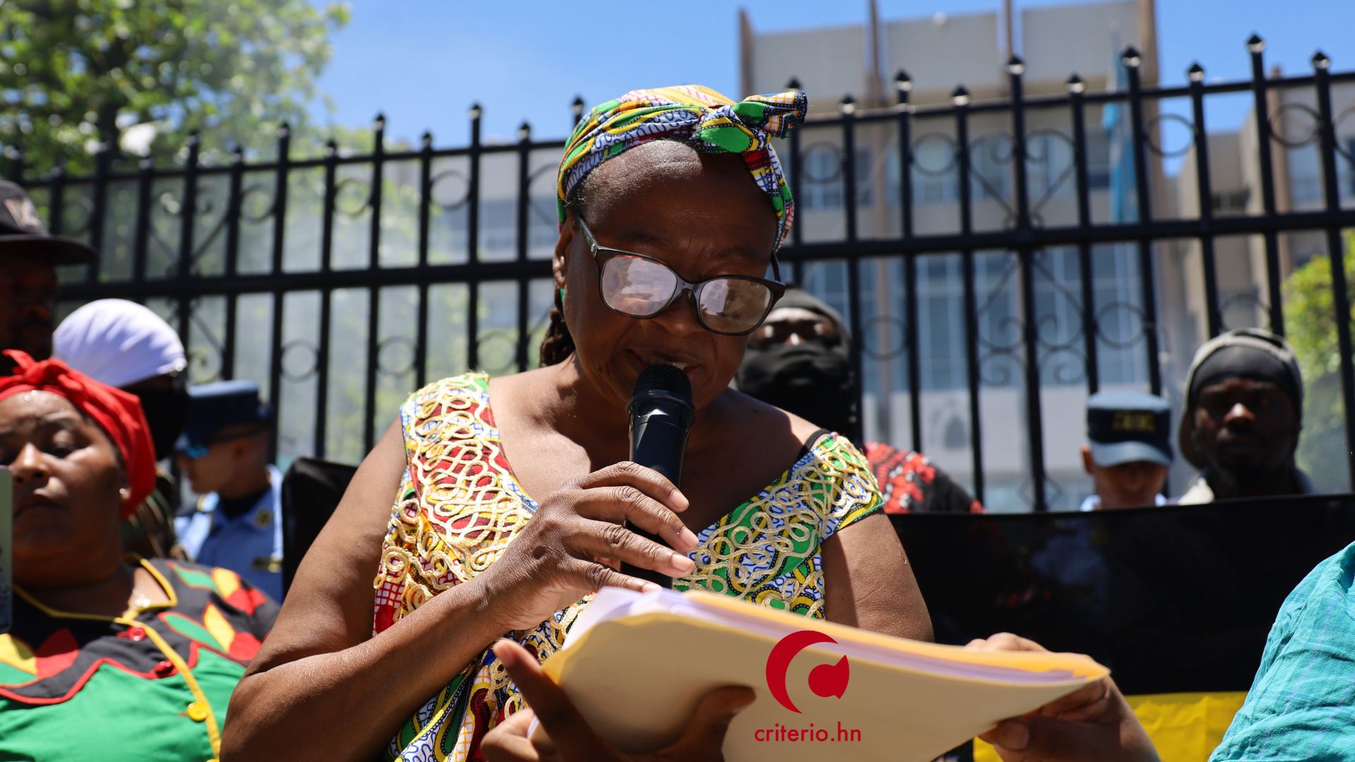 “Estamos interponiendo una acción de constitucionalidad para que la Corte Suprema haga un llamado al nuevo gobierno. Sabemos que son del mismo saco, pero una cosa que deben tener claro es que la ley debe ser imparcial, la ley debe aplicarse donde sea y por eso es por lo que hoy estamos aquí”, afirmó la lideresa garífuna y coordinadora general de la Ofraneh, Miriam Miranda.