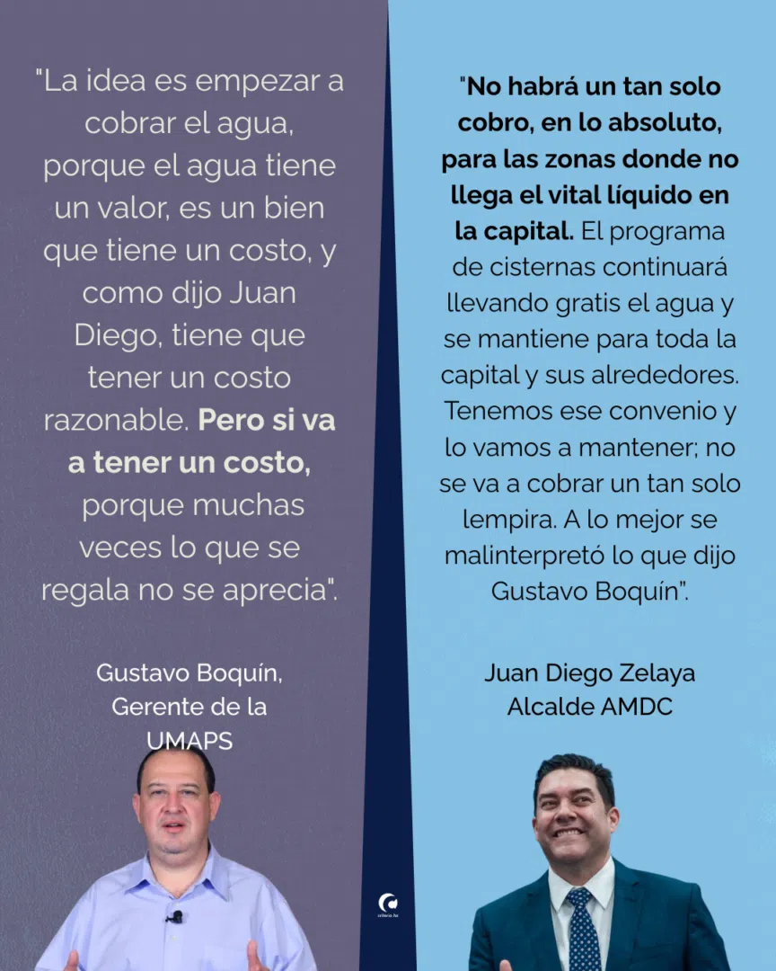 Durante la transmisión, mientras Juan Diego Zelaya recalcaba que actualmente la distribución del agua en cisternas es gratuita, Boquín expuso su estrategia para empezar a cobrar el servicio, argumentando que “la UMAPS no puede estar subsidiando todo”. También adelantó que el costo del agua aumentaría para quienes viven en zonas de alta plusvalía, como Lomas del Guijarro, donde —según dijo— muchos pagan alrededor de 300 lempiras mensuales.