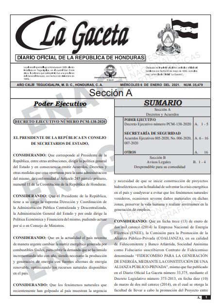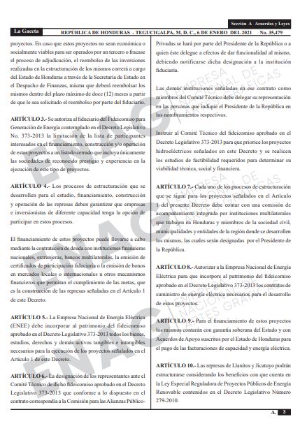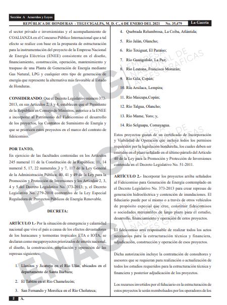 El artículo 1 reza que por la situación de emergencia y calamidad nacional que vive Honduras a causa de los devastadores huracanes Eta y Iota, se declaran megaproyectos priorizados de interés nacional, el diseño, construcción, ampliación y operación de las siguientes represas: