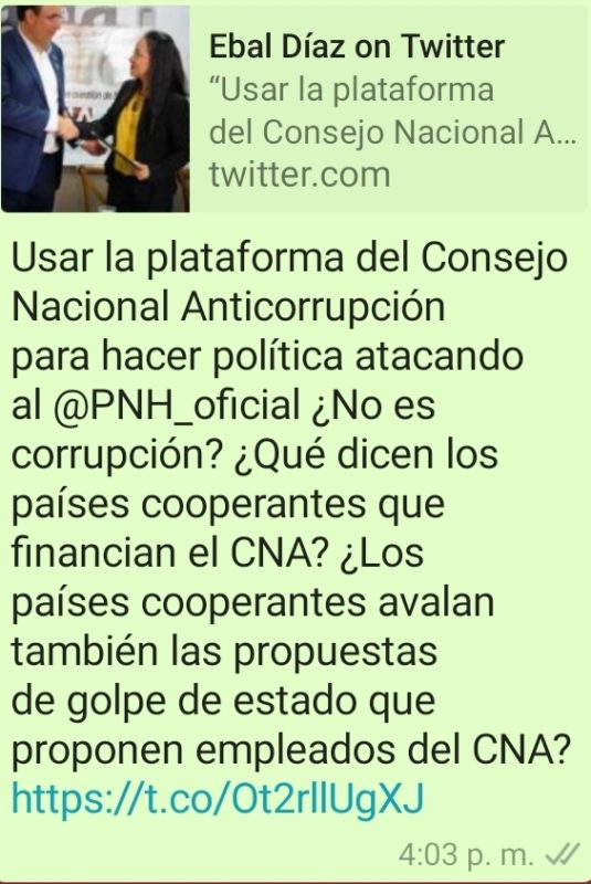 El Consejo Nacional Anticorrupción (CNA), ante la comunidad nacional e internacional, expresa su rechazo ante los ataques sistemáticos de los que ha sido objeto por parte del Gobierno por su postura independiente de combate y prevención a la corrupción e impunidad, y en ese sentido se manifiesta en los siguientes términos: