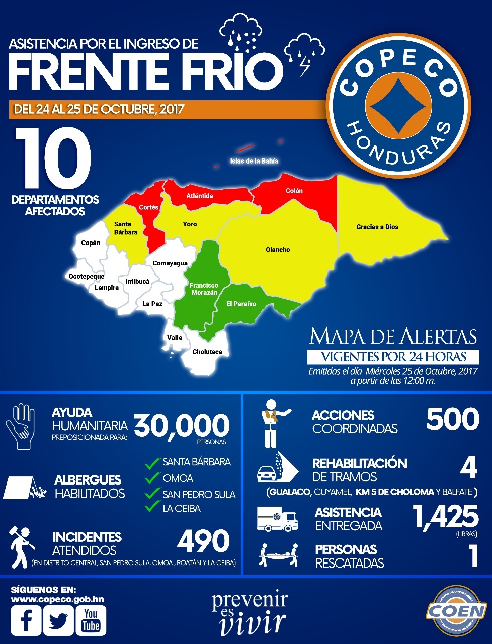 Luego, Lisandro Rosales, ministro del Comité Permanente de Contingencias (Copeco), detalló que la emergencia nacional es para Islas de la Bahía, Cortés, Atlántida y Colón (alerta roja) y Santa Bárbara y Gracias a Dios (alerta amarilla).