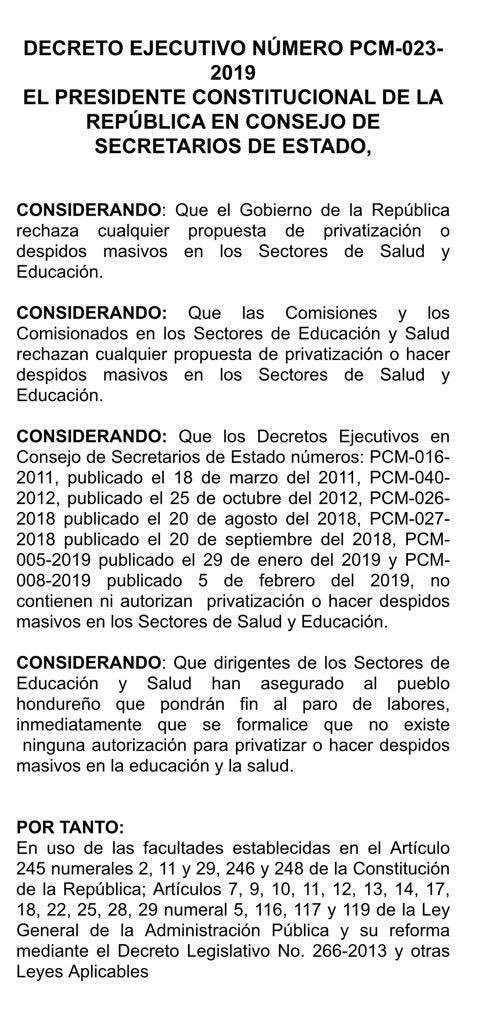 Tegucigalpa.-El gobierno de Honduras prometió la noche de este domingo derogar los decretos ejecutivos de la salud y la educación y procedió a firmar un acuerdo con una facción del magisterio para la aprobación de dos decretos ejecutivos nuevos.