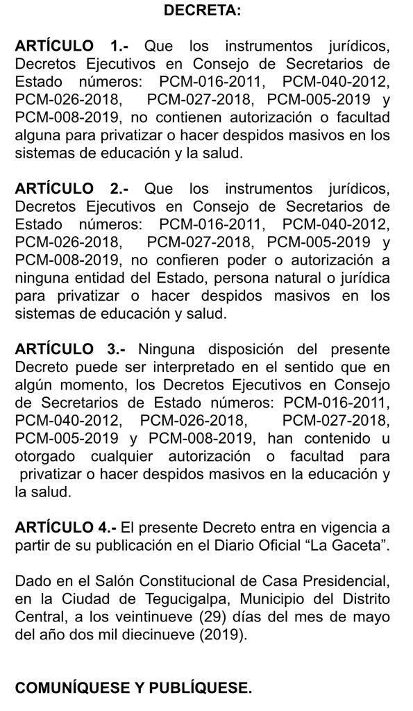 En el artículo 2 se instituye la derogación en su totalidad de los decretos ejecutivos número PCM 16-2011, PCM 40-2012, PCM 27-2018 y PCM 08-2019. Los decretos se relacionan a la criminalización de la protesta por parte de los maestros y a la declaratoria de la emergencia en el sistema de salud. Asimismo, a la integración de comisiones, con funciones y poderes exclusivas de la secretaría de Educación.