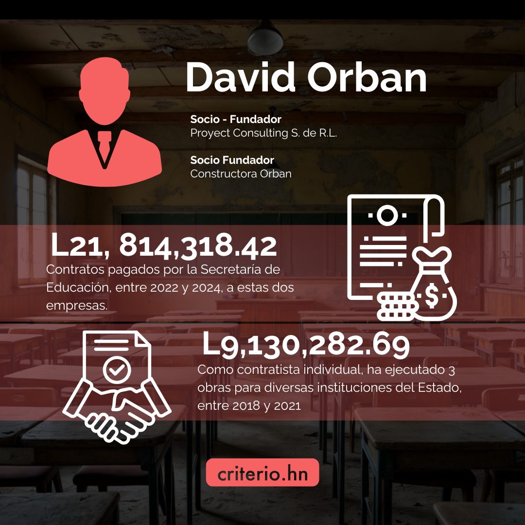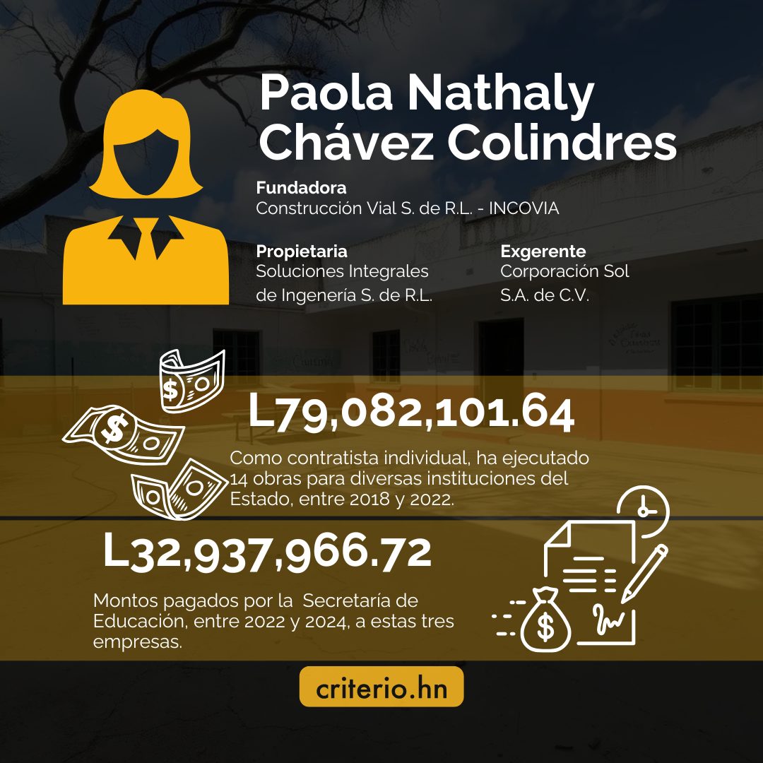 La construcción de proyectos escolares también está concentrada en manos de empresas de un mismo propietario. Según la revisión de Criterio.hn, uno de los involucrados bajo esta mecánica es David Lambur, fundador de las empresas Proyect Consulting S. de R.L. y Constructora Orban. De manera similar, Paola Nathaly Chávez Colindres figura como fundadora de la empresa Ingeniería de Construcción Vial S. de R.L. (Incovia) y, desde 2024, como propietaria de Soluciones Integrales de Ingeniería S. de R.L. Además, aparece como exgerente de la empresa que mencionamos antes, Corporación Sol S.A. de C.V. entidades que también han recibido millonarios contratos adjudicados por la Secretaría de Educación.