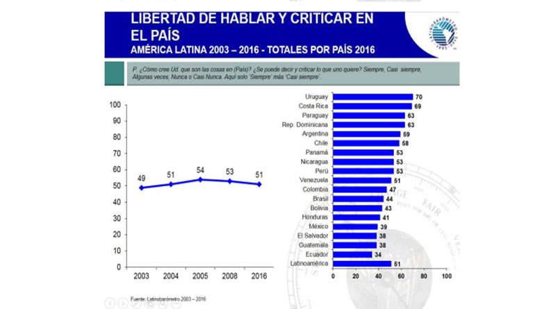 Producto de la represión, las dictaduras dejan un halo de miedo en la población, dice el informe. En América Latina cerca de la mitad de la población sintió en 2016 que tenía la libertad de criticar (51%), pero en Honduras solo el 41% de la población sintió que tenía esa libertad.