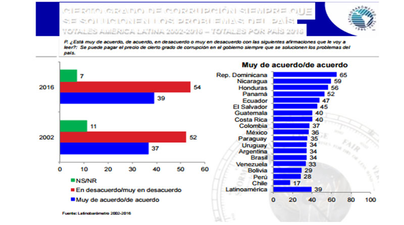 Un hallazgo que llama mucho la atención es que Honduras aparece entre los tres países de la región latinoamericana donde su población es más tolerante a los actos de corrupción de sus gobernantes, ocupando el tercer lugar, superado únicamente por República Dominicana y Nicaragua. El 56% de los entrevistados ponderan si acaso vale la pena tolerar la corrupción a cambio de que los gobiernos logren solucionar los problemas del país.