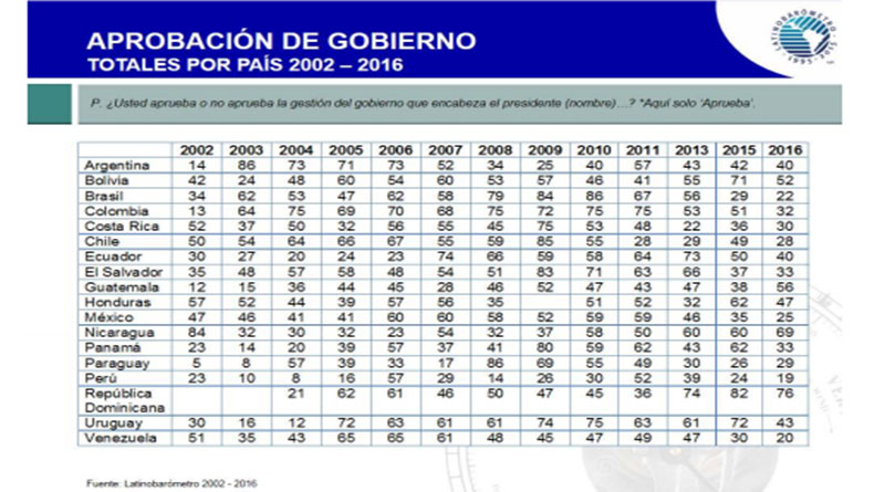 Tegucigalpa.-La evaluación del gobierno de Honduras que encabeza el presidente, Juan Hernández, ha experimentado una caída estrepitosa de 15 puntos en el último año, según el Informe Latinobarómetro 2016, que establece que después de haber alcanzado una calificación de 62% en el 2015 bajó a 47% en el 2016.