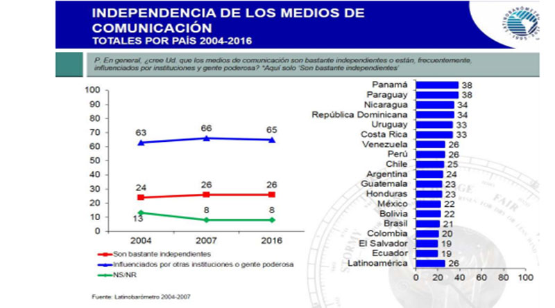 Otro de los hallazgos es que solo el 23% de la población de Honduras cree que los medios de comunicación son independientes, la mayoría piensa que éstos son influenciados por los poderosos.