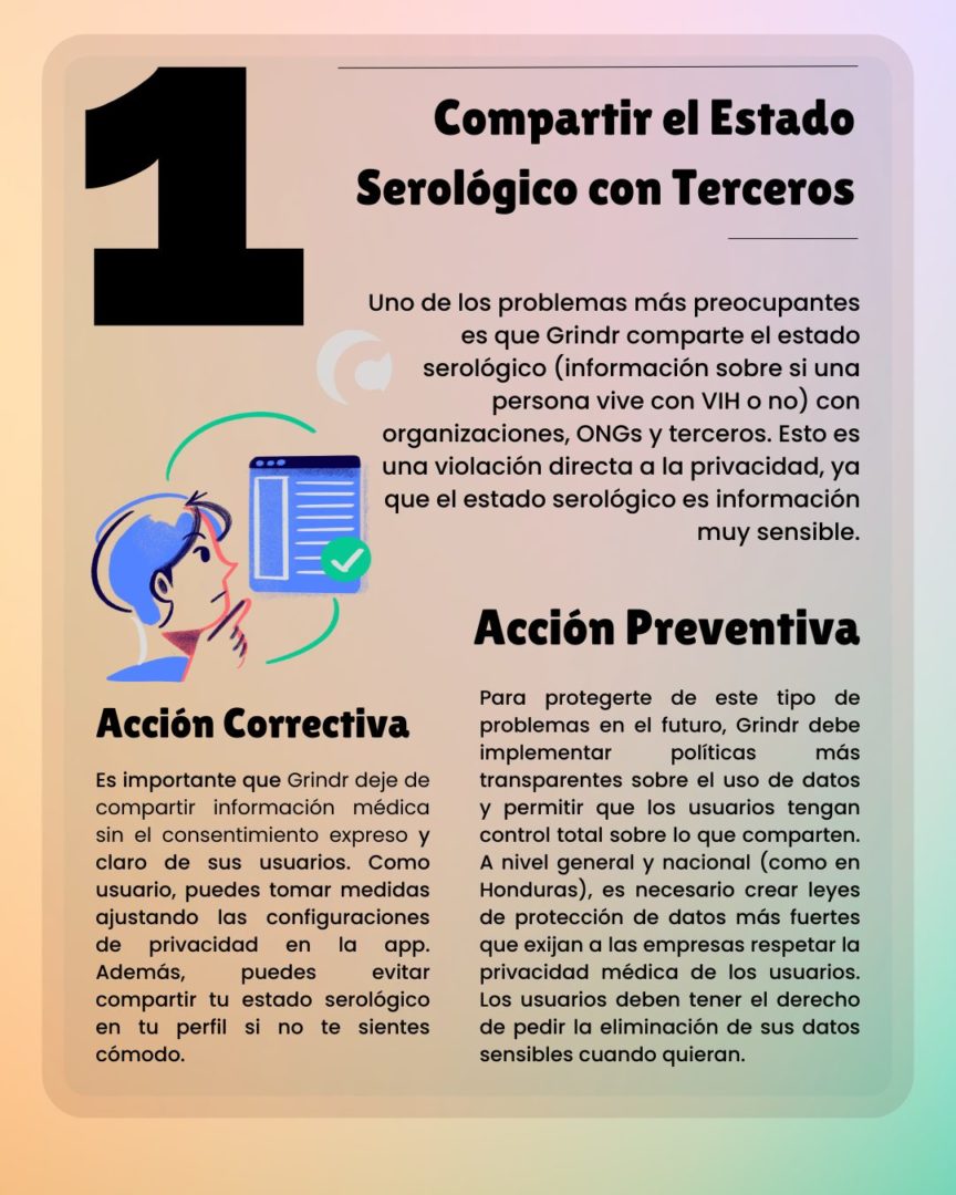 Por su parte, Lucía Barrientos relató que, como parte de programas de salud sexual y prevención de ITS, intentó crear un perfil personal en Grindr para ofrecer servicios de prevención del VIH y promover el uso de anticonceptivos dentro de la plataforma. Sin embargo, sus cuentas fueron eliminadas repetidamente, bajo el argumento de que su actividad era considerada “empresarial”, privando a los usuarios de una oportunidad vital para acceder a recursos de prevención.