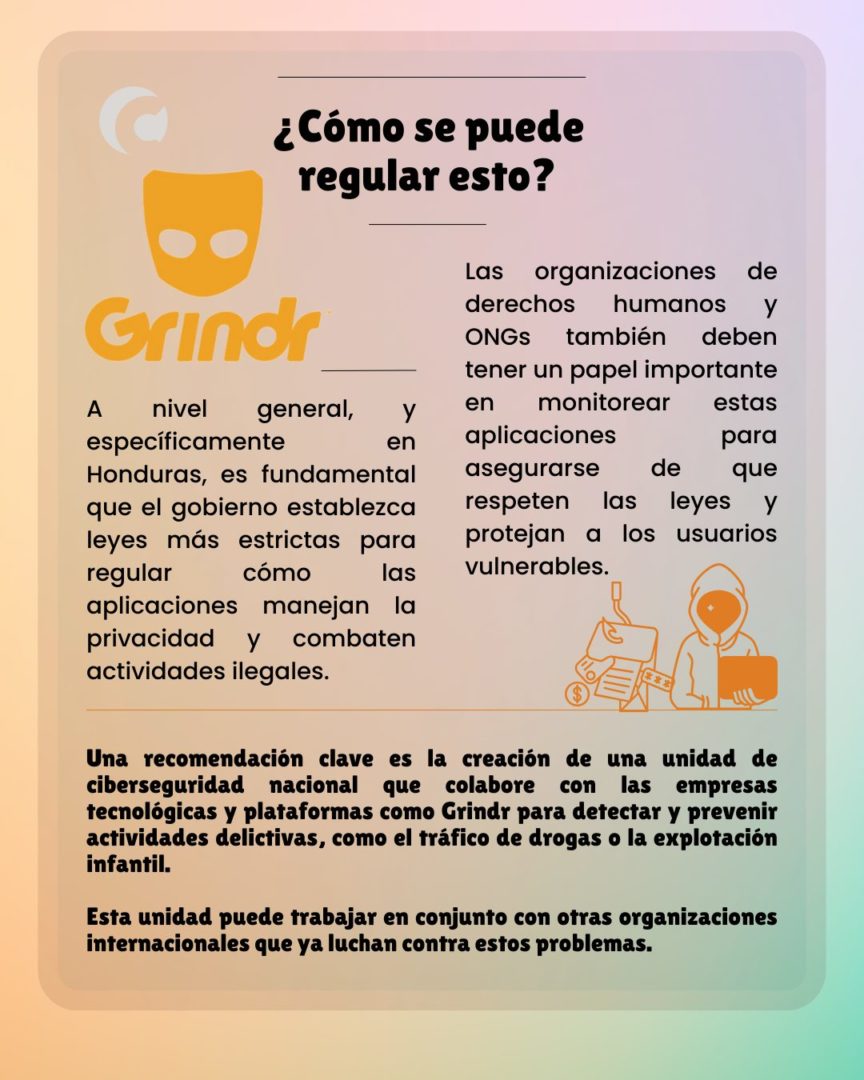 En Honduras, Grindr puede solicitar al usuario eliminar su cuenta si infringe las normas y si la persona se niega a hacerlo, los oficiales de control de la aplicación tienen la autoridad para eliminar la cuenta o contenido que se considere ilegal. Sin embargo, en la práctica, los vacíos en la supervisión y aplicación de estas normas ponen en duda la capacidad real de Grindr para controlar lo que sucede en su plataforma.