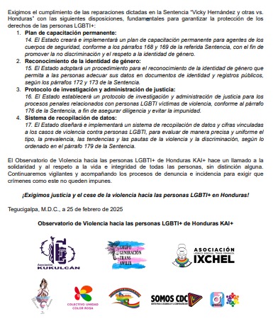 El pasado 25 de febrero, el Observatorio de Violencia hacia las personas LGBTI+ de Honduras KAI+, emitió un pronunciamiento público en el que expusieron su consternación y condenaron el crimen en contra de la activista, que se suma a larga lista de homicidios en contra de la población trans del país.