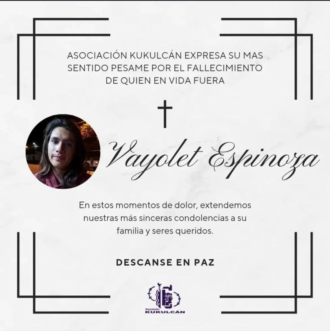 Vayolet Espinoza Mendoza era una activista trans de 28 años de edad, originaria de la ciudad de Tegucigalpa, y residente de Guaimaca en la zona norte del departamento de Francisco Morazán. Dedicó parte de su vida a la defensa y promoción de los derechos de las personas LGBTIQA+, a través de la Red de Derechos Humanos de dicho municipio.