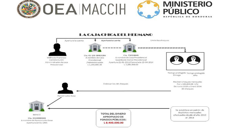 La fiscalía considera probado que los imputados en el denominado caso “Caja chica del hermano” crearon un entramado para desviar en beneficio propio dinero público que estaba inicialmente destinado a sufragar los gastos de seguridad de la Casa Presidencial. Por este medio, según la investigación, los imputados presuntamente se embolsaron irregularmente 8,4 millones de lempiras (unos 350.000 dólares).
