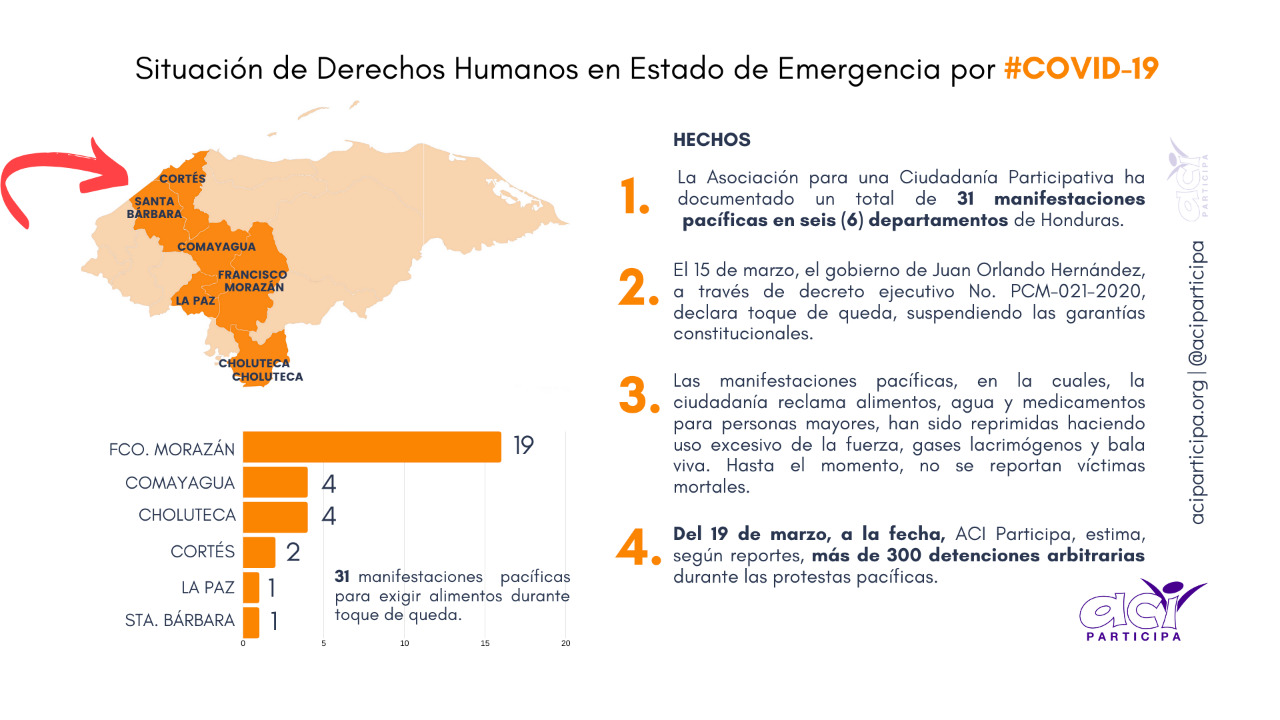 El 15 de marzo, el gobierno nacionalista que preside Juan Hernández a través del decreto ejecutivo PCM-021-2020, declaró toque de queda, suspendido las garantías constitucionales.