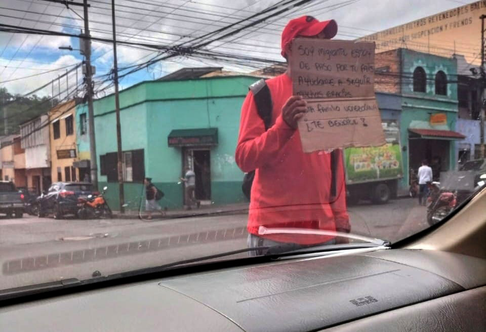 En uno de los semáforos de Comayagüela, un venezolano, esperaba pacientemente el cambio de luz, para poder limpiar el vidrio frontal de los vehículos. “Soy migrante, estoy de paso por tu país, ayúdame a seguir. Muchas gracias. Esta familia venezolana te bendice”. Se podía leer en un cartel improvisado en un pedazo de cartón.