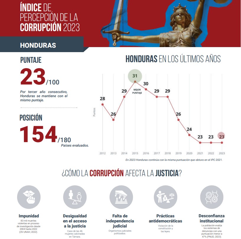 De acuerdo al indicador mundial de la corrupción en el sector público (creado en 1995), Honduras tiene una puntuación de 23 puntos, entre el rango de 0 a 100 que mide la corrupción. Calificación que ha recibido en los últimos dos años por lo cual lo ubican en el puesto 154 de los 180 países evaluados.
